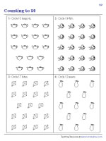 Introduce cardinality to children with our counting-to-20 worksheets, where they count the objects in each set and circle the exact number represented from four options.