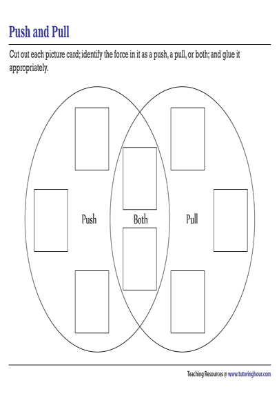 Push ahead with your plans to expand science learning with our printable push, pull, or both - Venn diagram worksheet! In a soccer game, when a player kicks a ball, he pushes it. Likewise when flying a kite, you pull it with a string to control its movement. Not to mention, there are some instances where both forces are exerted as well. We push as well as pull a trolley, and we push and pull a thumbtack in and out of a bulletin board, and so on. Can you classify such situations as those that involve a push, pull, or both? Assess yourself with our pdf worksheet! Cut out the pictures, and glue them onto the circles or the intersection according to the forces they illustrate.